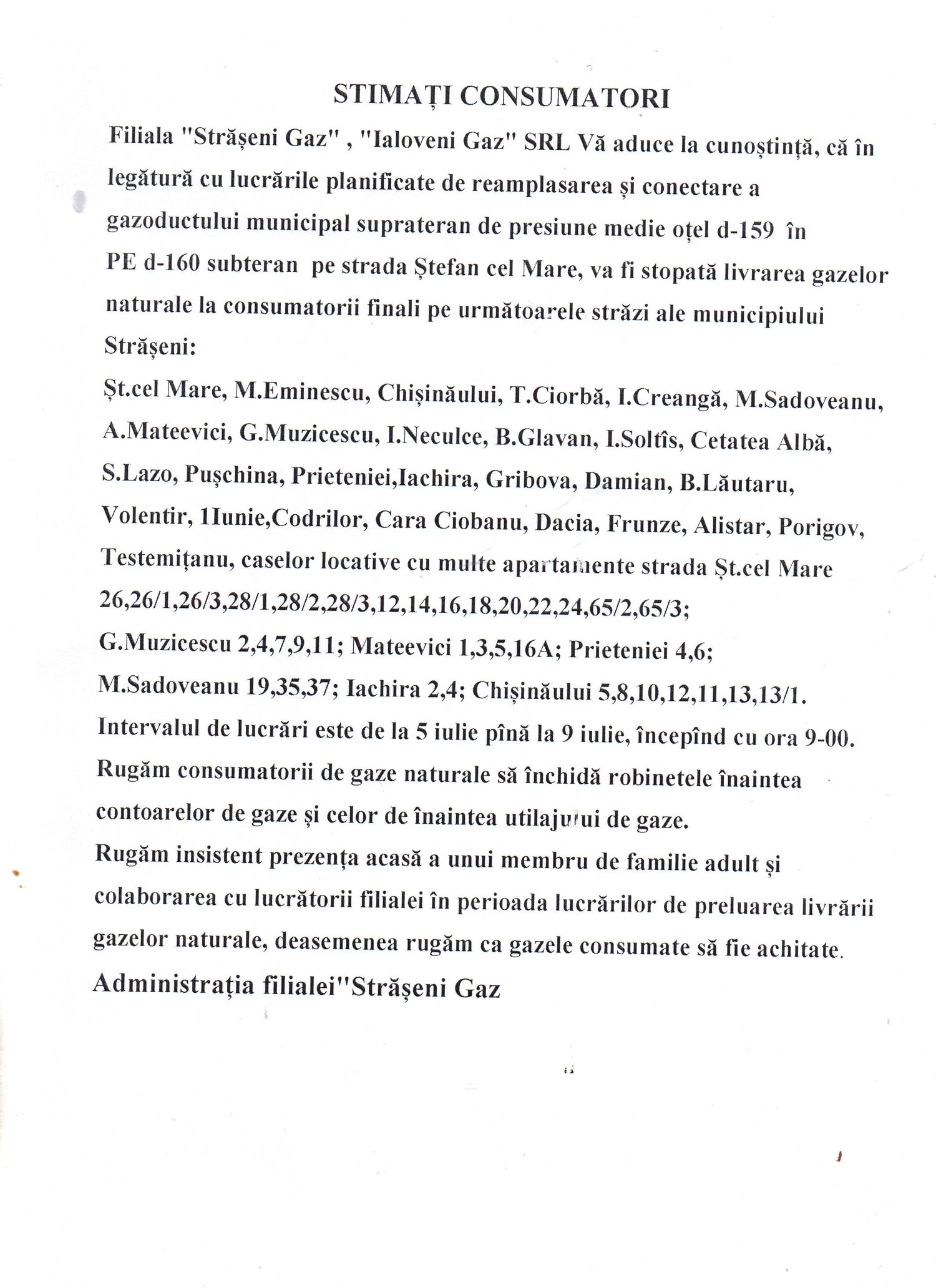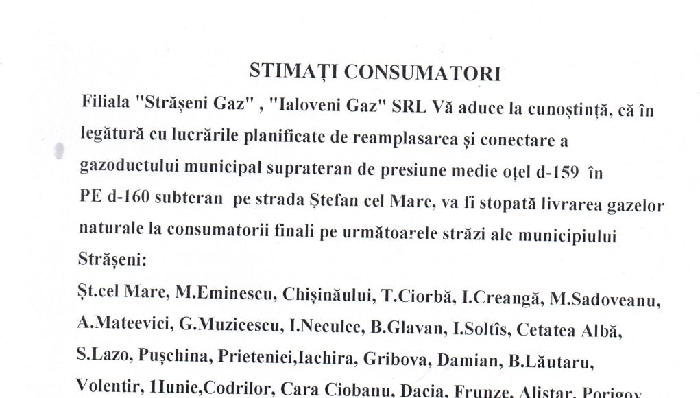 ÎN ATENŢIA CONSUMATORILOR, FILIALA ” STRĂŞENI GAZ”, „IALOVENI GAZ” !