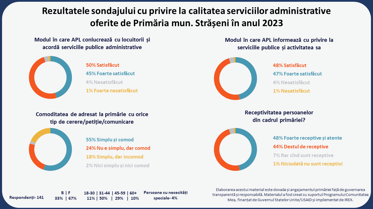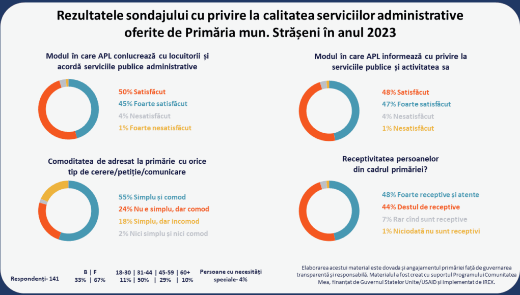 Vă propunem rezultatele sondajului cu privire la calitatea serviciilor administrative oferite de Primăria Municipiului Strășeni, plasat la finele anului 2023.